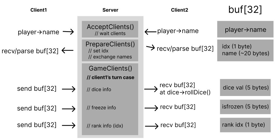 이런 식으로 32바이트 buf 하나로 주고받는다.. 게임이 간단해서 가능한거지, 좀만 더 복잡해지면 아마 이런 간단한 방식으론 힘들지 않을까 싶다.