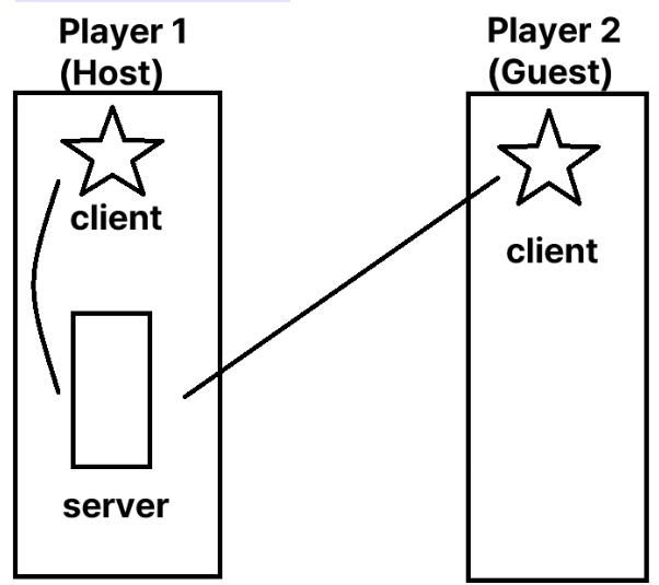 마인크래프트의 버킷 서버가 생각났고, Player 중 한 명이 server를 열고 여기에 두 Player가 접속하는 방식을 생각하게 되었다.