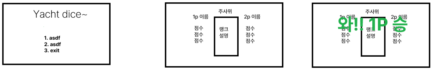 메인 화면 -> 게임 메뉴 선택 -> 플레이어 이름 입력(player 객체 초기화) -> (13 라운드 * N 명) 번의 턴 진행 -> 점수 비교 후 승자 출력 -> 나가기..?
